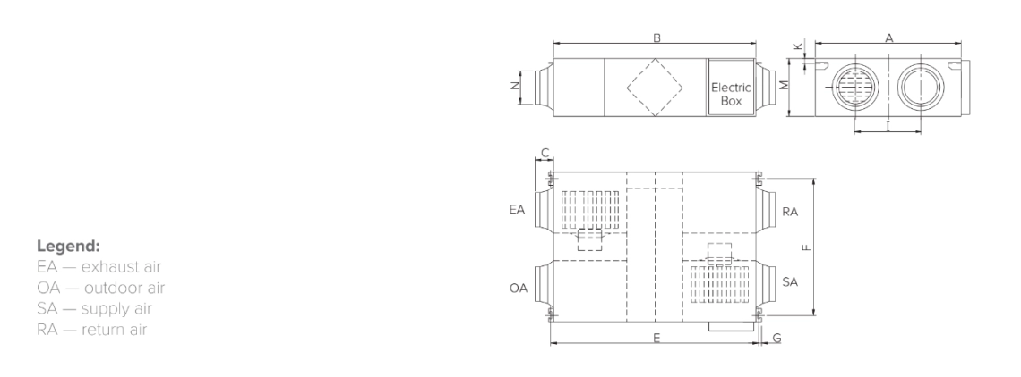 Fresh air supply through the recuperator for heat recovery mode or direct for bypass mode.